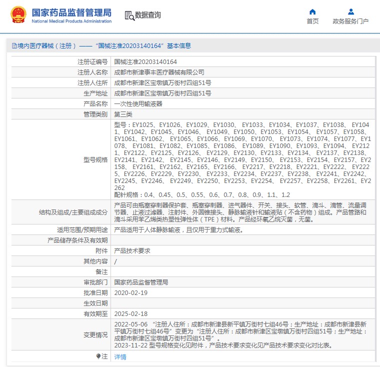 产品可由瓶塞穿刺器保护套、瓶塞穿刺器、进气器件、开关、接头、软管、滴斗、滴管、流量调节器、止液过滤器、注射件、外圆锥接头、静脉输液针和输液贴(不含药物)组成。产品管路和滴斗采用苯乙烯类热塑性弹性体(TPE)材料。产品经环氧乙烷灭菌,无菌。