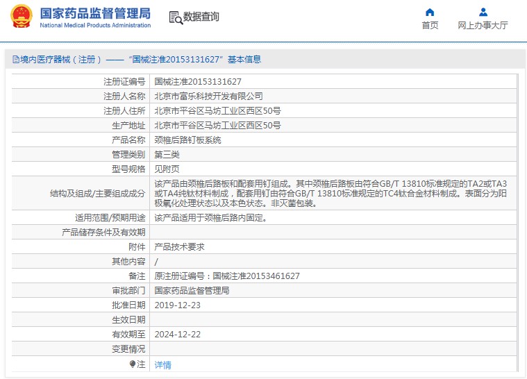 该产品由颈椎后路板和配套用钉组成。其中颈椎后路板由符合GB/T 13810标准规定的TA2或TA3或TA4纯钛材料制成,配套用钉由符合GB/T 13810标准规定的TC4钛合金材料制成。表面分为阳极氧化处理状态以及本色状态。非灭菌包装。
