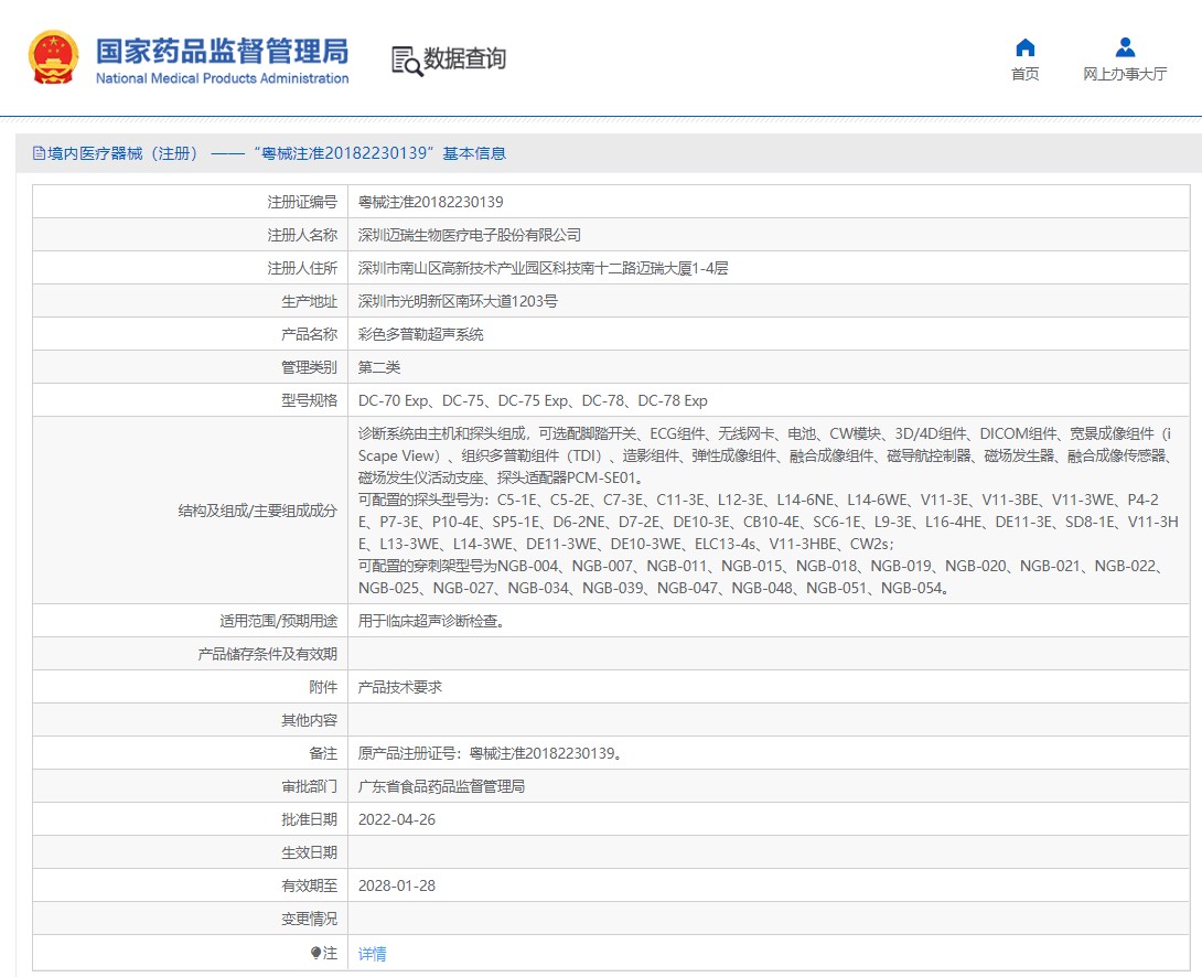 诊断系统由主机和探头组成,可选配脚踏开关、ECG组件、电池、CW模块、3D/4D组件、DICOM组件、宽景成像组件(iScape)、组织多普勒组件(TDI)、造影组件、弹性成像组件。可配置的探头型号为: C5-1E、C5-2E、C7-3E、C11-3E、L12-3E、L14-6NE、L14-6WE、V11-3E、V11-3BE、V11-3WE、P4-2E、P7-3E、P10-4E、SP5-1E、D6-2NE、D7-2E、DE10-3E、CB10-4E、7LT4E、SC6-1E、L9-3E、L16-4HE、DE11-3E、SD8-1E、V11-3HE;可配置的穿刺架型号为NGB-004、NGB-007、NGB-010、NGB-011、NGB-015、NGB-018、NGB-019、NGB-020、NGB-021、NGB-022、NGB-025、NGB-027、NGB-034。用于临床超声诊断检查。