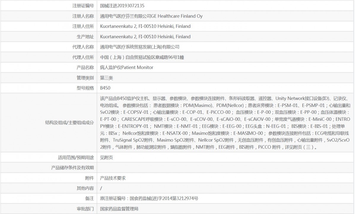 该产品由B450监护仪主机、显示器、参数模块、参数模块连接附件、条形码读取器、遥控器、Unity Network接口设备(ID)、记录仪、电池组成。 参数模块包括: 患者数据模块:PDM(Masimo)、PDM(Nellcor);患者床旁模块:E-PSM-01、E-PSMP-01;心输出量和SvO2模块:E-COPSV-01;心输出量模块:E-COP-01、E-PiCCO-00; 血压模块:E-P-00;双血压模块:E-PP-00;血压体温模块:E-PT-00; CARESCAPE呼吸模块:E-sCO-00、E-sCOV-00、E-sCAiO-00、E-sCAiOV-00;单宽度气道模块:E-MiniC-00;ENTROPY模块:E-ENTROPY-01; NMT模块:E-NMT-01;EEG模块:E-EEG-00;EEG头盒:N-EEG-01; BIS模块:E-BIS-01;处理单元:BISx; Nellcor饱和度模块:E-NSATX-00;Masimo饱和度模块:E-MASIMO-00; 参数模块连接附件包括:ECG电缆和导联线附件、TruSignal SpO2附件、Masimo SpO2附件、Nellcor SpO2附件,无创血压附件,有创血压附件,心输出量附件,SvO2/ScvO2附件,气体附件,肺功能测定附件,熵指数附件,NMT附件,EEG附件,BIS附件,PiCCO 附件,详见附页(三)。