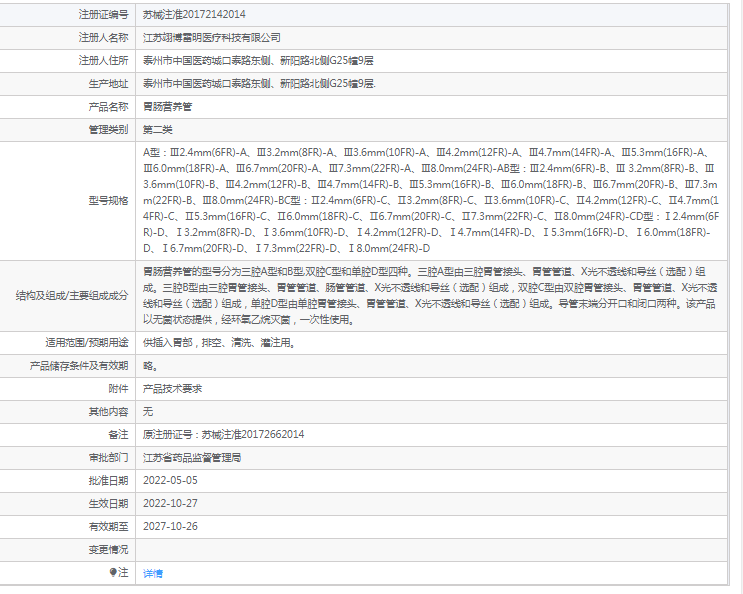 胃肠营养管的型号分为三腔A型和B型,双腔C型和单腔D型四种。三腔A型由三腔胃管接头、胃管管道、X光不透线和导丝(选配)组成。三腔B型由三腔胃管接头、胃管管道、肠管管道、X光不透线和导丝(选配)组成,双腔C型由双腔胃管接头、胃管管道、X光不透线和导丝(选配)组成,单腔D型由单腔胃管接头、胃管管道、X光不透线和导丝(选配)组成。导管末端分开口和闭口两种。该产品以无菌状态提供,经环氧乙烷灭菌,***次性使用。
