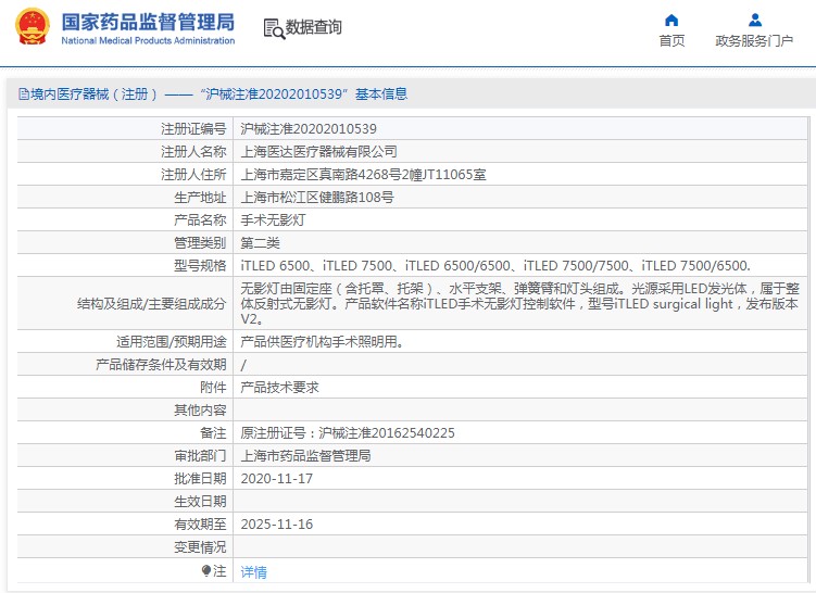 无影灯由固定座(含托罩、托架)、水平支架、弹簧臂和灯头组成。光源采用LED发光体,属于整体反射式无影灯。产品软件名称iTLED手术无影灯控制软件,型号iTLED surgical light,发布版本V2。